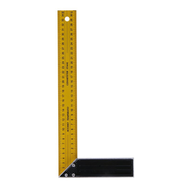 Asztalos derékszög 90 fokos szögek megjelölésére és rajzolására. Festett alumínium anyagból, milliméter beosztással. Rövid száron párhuzamos jelöléshez ütközővel.