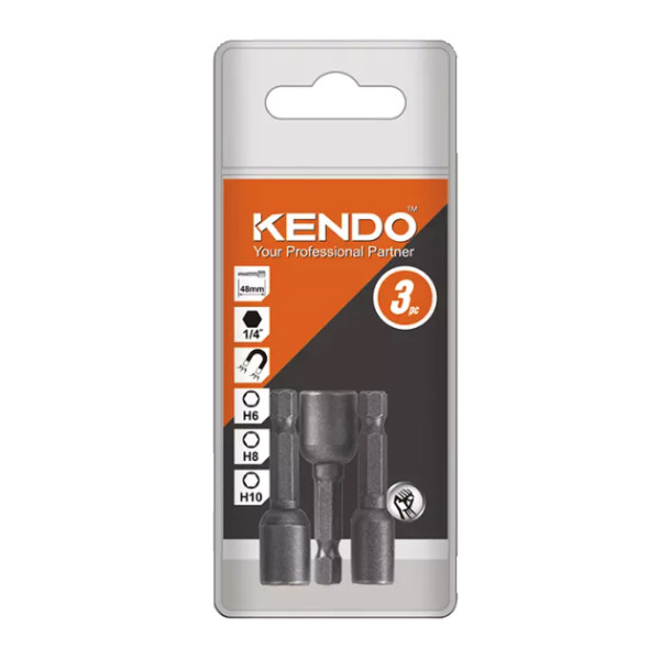 KENDO 1/4" Mágneses Bit-Dugófej Készlet 3 db – 6, 8, 10 mm (48 mm, CrV)
