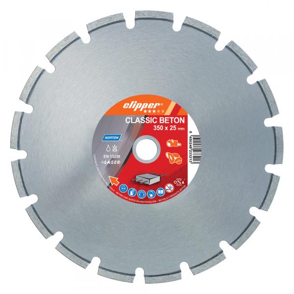 A Norton Clipper CLASSIC BETON egy jó ár/érték arányú lézerhegesztett tárcsa vizes vagy száraz vágáshoz. Alkalmas beton és általános építőipari anyagok vágására, mint mosot beton, vasbeton, beton burkolólap, áthidaló, mészkőbeton, betoncserép.