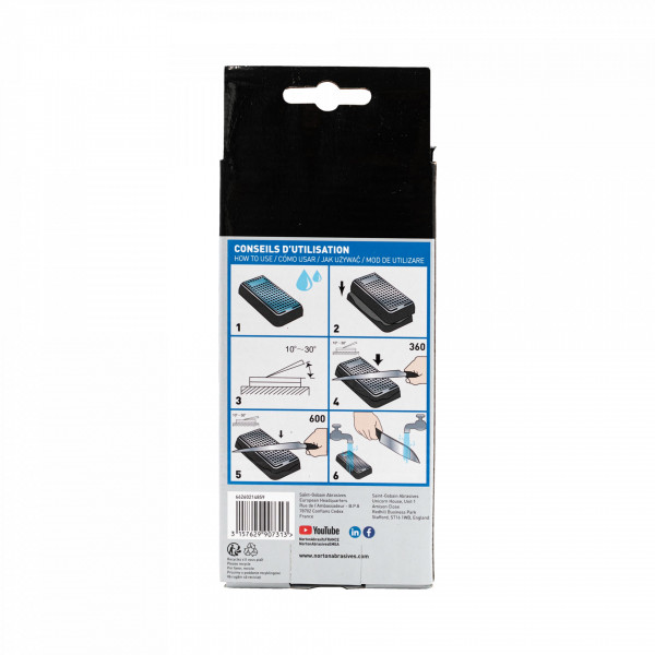 A kétoldalú gyémánt élező kő egyik oldala durva P360 kés élezéshez, másik oldala finom P600 a kés élének polírozásához. A kemény gyémánt szemcsék biztosítják, hogy hónoláshoz és minden típusú késhez, ollóhoz, még a kerámia késekhez is használható. Csúszásmentes talppal és műanyag védőburkolattal rendelkezik, amely megakadályozza a kő elmozdulását használat közben. Méret: 185x65x32 mm;