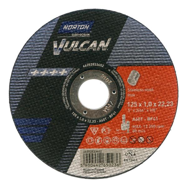 A Norton Vulcan 125x1 mm A60T INOX vágótárcsa kézi sarokcsiszolóval történő daraboláshoz fejlesztett kimondottan INOX, rozsdamentes anyagok megmunkálásához kialakított kiváló minőségű vágókorong.