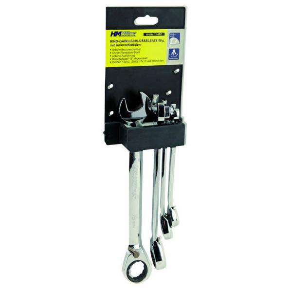 Müllner belső racsnis csillag-villáskulcs készlet, 4 részes, 10, 13, 17, 19 mm, 15 fokos döntött fejű CrV kulcsokkal.