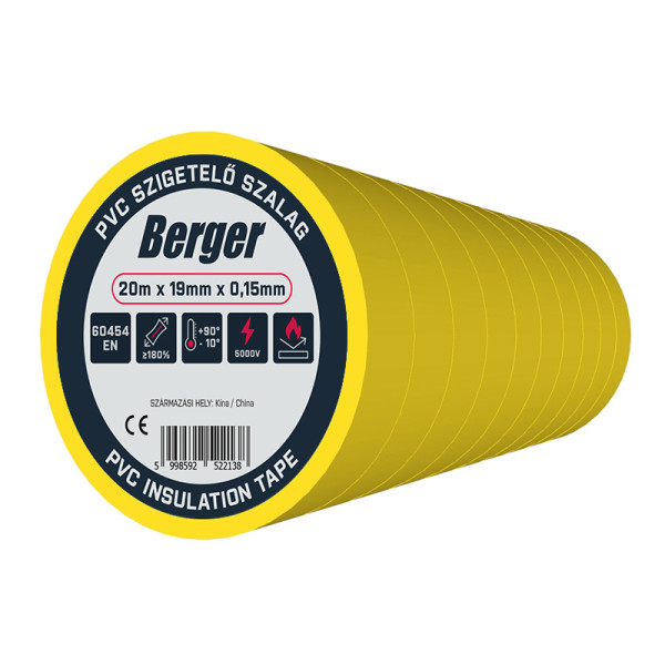 BERGER PVC szigetelőszalag Sárga 20mx19mm/0,15mm – Tartós, rugalmas szigetelés villanyszerelési feladatokhoz