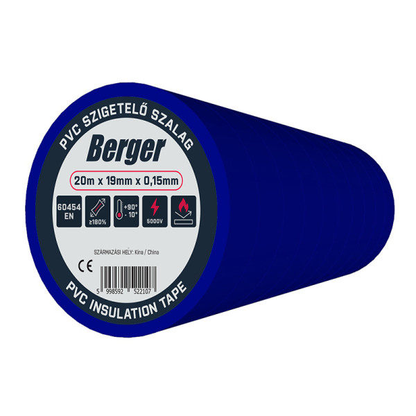 BERGER PVC szigetelőszalag Kék 20mx19mm/0,15mm – Megbízható, rugalmas szigetelés villanyszerelési feladatokhoz