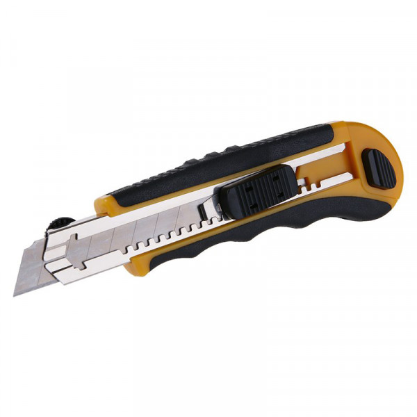 Tapétavágó kés cserélhető pengével, és csúszásmentes, gumi bevonatos, ergonomikus markolattal. Nyomógombos rögzítés, ami lehetővé teszi a gyors penge állítást. A fém penge vezetősín és kivezető a tartósságot és a kés masszívságát segíti elő.